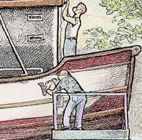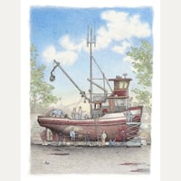 It's prep season and this outfit is getting the boat ready for salmon season. The crew is moving parts, sanding the house and painting the bottom while the skipper looks on. A shipwright has done some work on the starboard hull and is finishing up by corking the planks.
